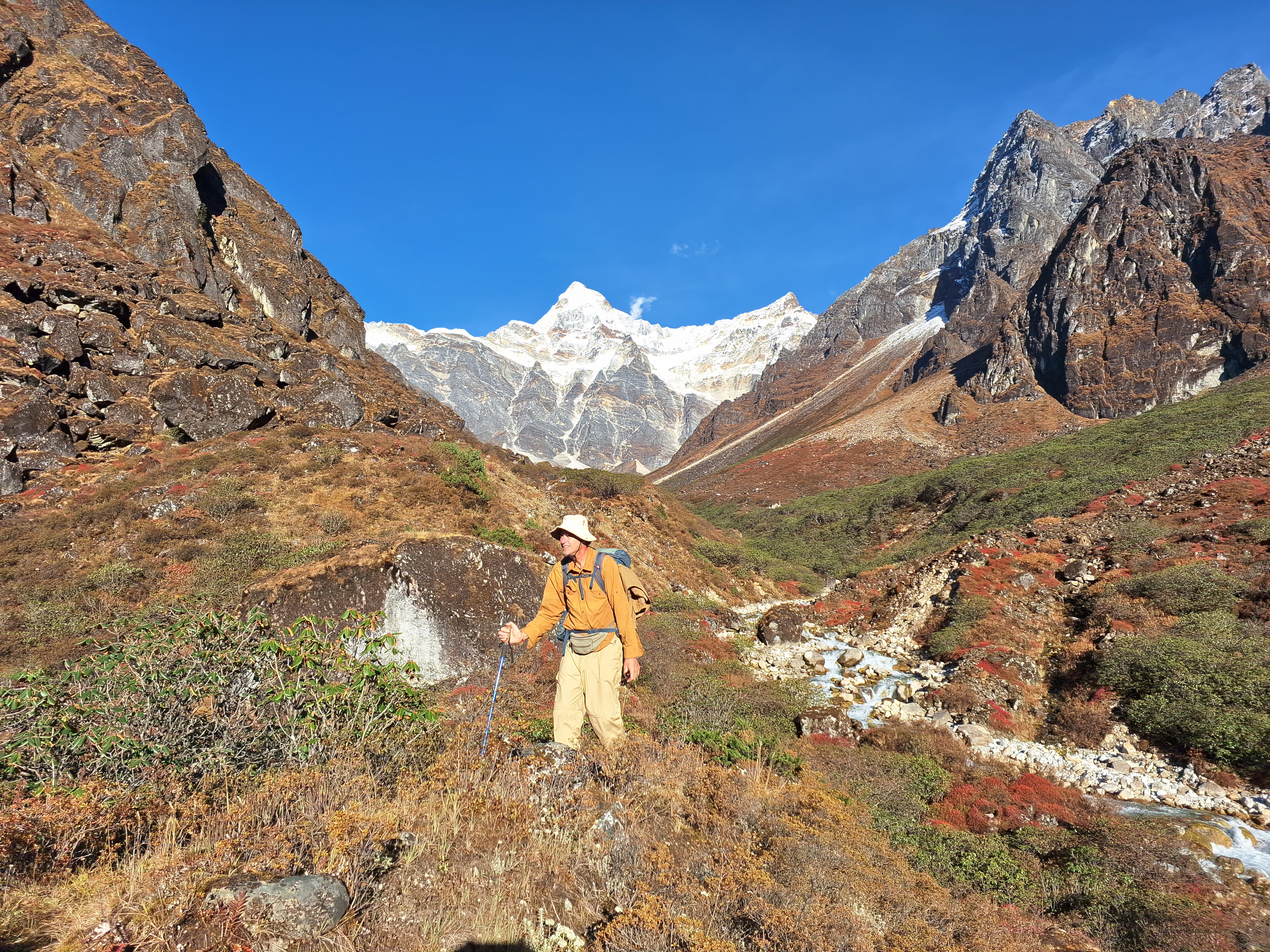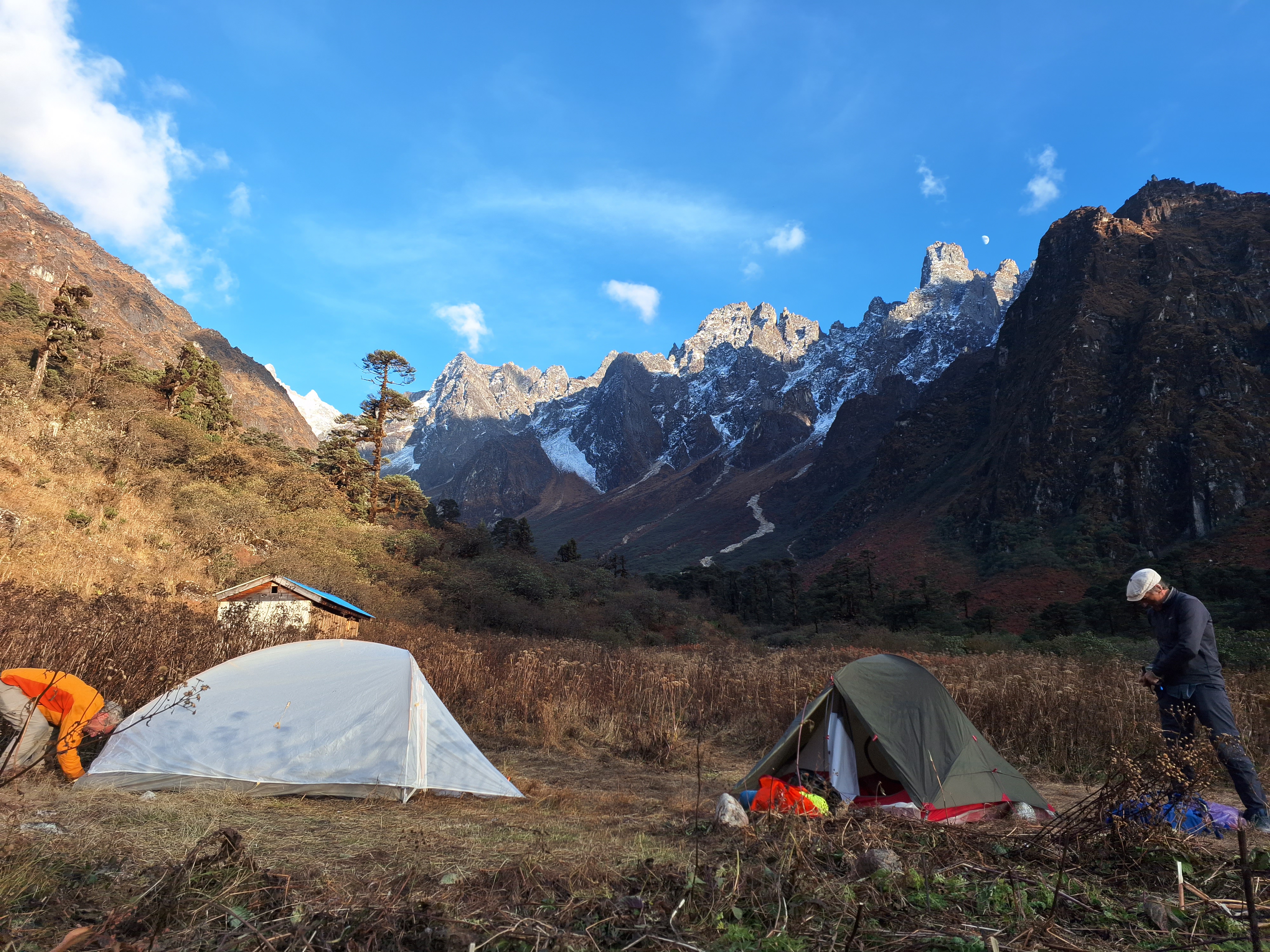 Ascend the valley, meeting herders preparing for winter. Camp near a shepherd hut with fire. 5 hours walk. Tent.