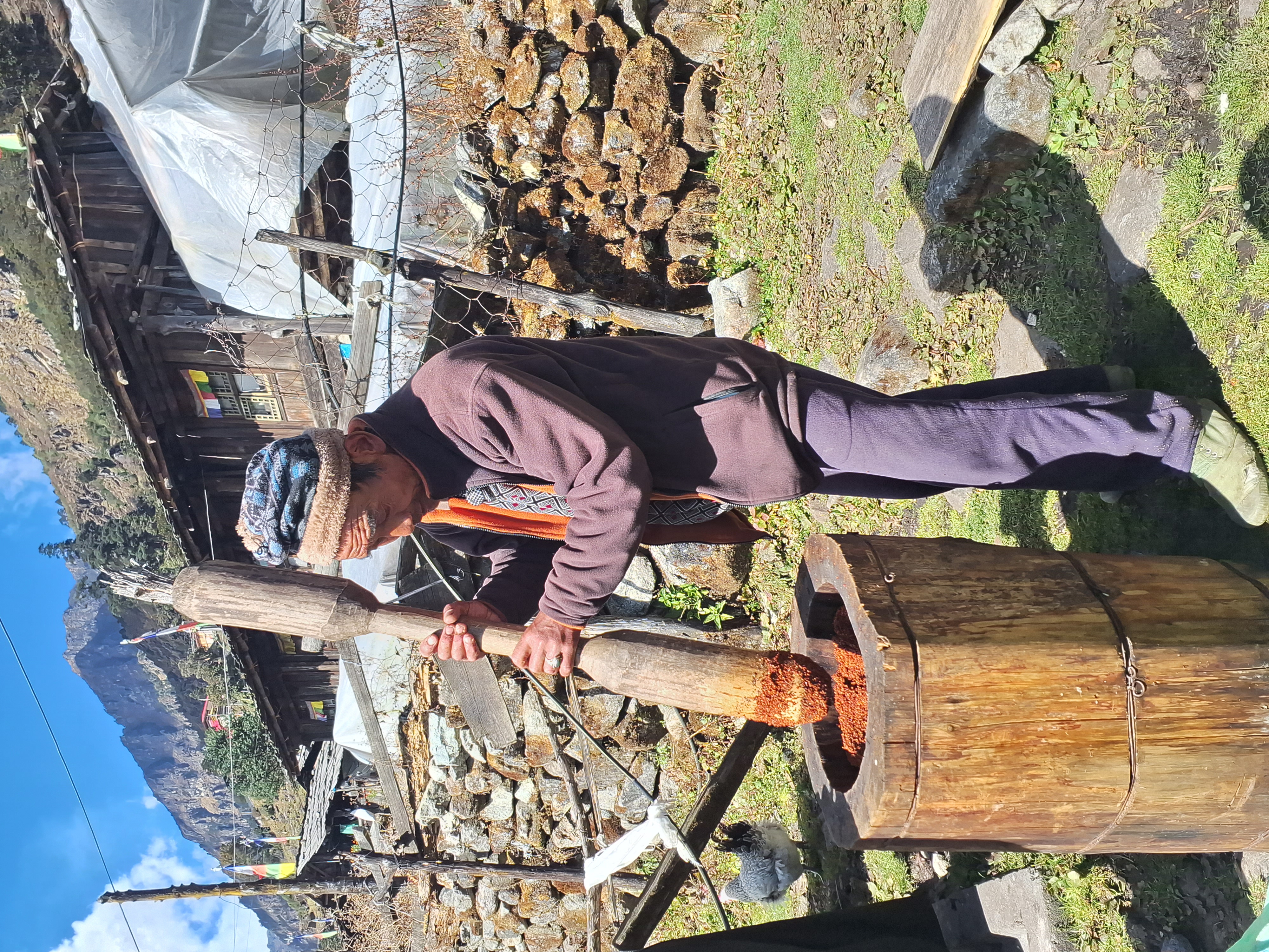 Cross a small pass, descend, then climb to Chyamtang village with terraced fields (millet, maize, bananas). Lodge.
